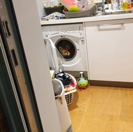 Tornare a casa e trovare una volpe che dorme dentro al cestello della lavatrice, non è certo cosa da tutti i giorni.