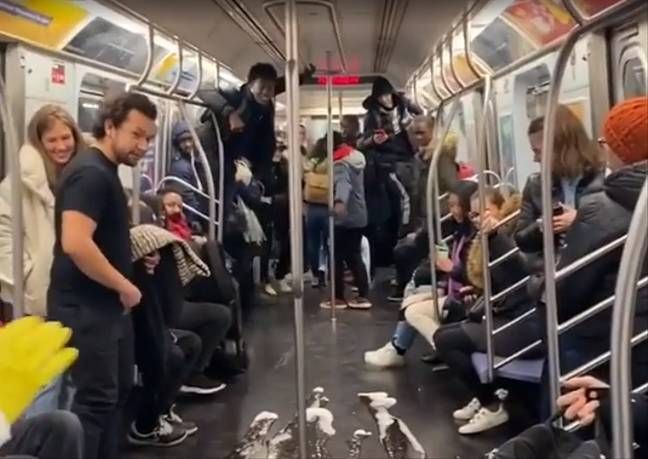 Due ragazzi vestiti in abiti ignifughi hanno scatenato il panico misto risate nella metropolitana di New York dopo aver fatto finta di rovesciare il coronavirus sul treno.