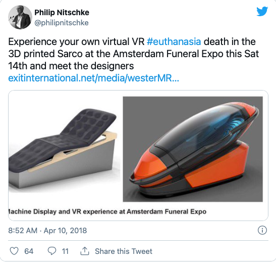 Philip Nitschke, soprannominato non a caso Dottor Morte, si è presentato al Funeral Fair di Amsterdam nel 2018 con la sua invenzione avveniristica, la Suicide Machine, e oggi, a dispetto delle reazioni dell’epoca, la macchina che fa vivere in maniera virtuale la propria morte viene esposta un po’ ovunque in Europa.